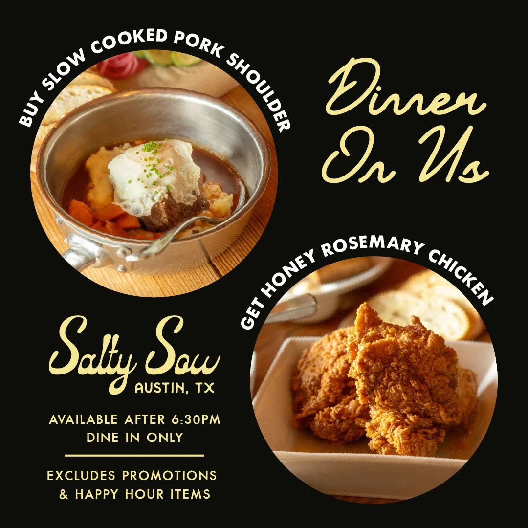 At Salty Sow, we’re serving more than just great food–we’re dishing out gatherings, good times, and unforgettable meals. Chef Harold Marmulstein blends slow-cooked Southern tradition with bold, fresh flavors that are pure Texas comfort, mindfully sourced from local farms and purveyors. Whether you’re here for a laid-back happy hour or to unwind over dinner, you’ll experience a warm, welcoming atmosphere that feels like home.